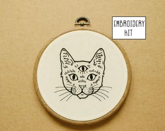 Three Eyed Cat Hand Embroidery Kit (modern hand embroidery wall hanging - tattoo embroidery - DIY embroidery kit)