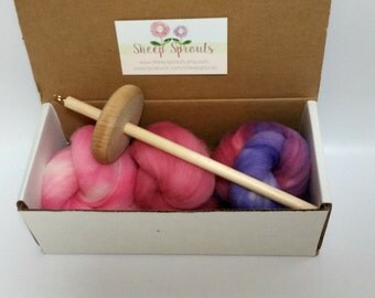 Learn to Spin Kit - Mini Kit - Drop Spindle + Fiber Bundle - Hand Dyed US Wool Roving - 1/2 (.5) oz each of 3 Colors US Wool + Spindle