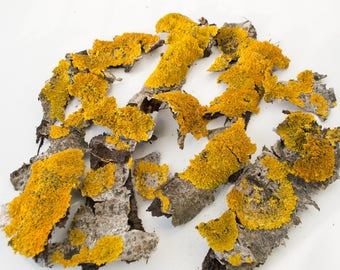 Yellow lichen on the bark, terrarium, natural material.