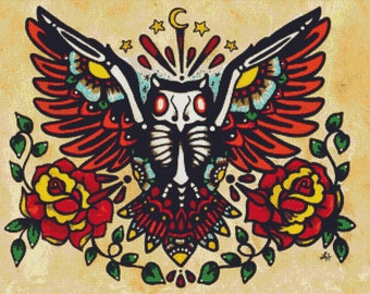 Dia De Los Muertos Cross Stitch kit 'Owl' By Illustrated Ink. - Modern tattoo cross stitch, counted cross stitch