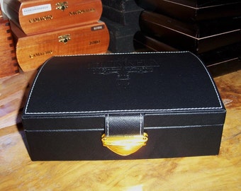 Leather Cigar Box Ghurka Treasure Chest Keepsake Black With Top Stitching Goldtone Clasp Jewelry Storage One In Stock by IndustrialPlanet