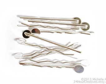Silver Bobby Pins with Glue Pad - Blank Hair Pins - Silver Plated Steel Hairpins - 63mm Bobby Hair Clip with 10mm Round Pad - Pack of 10 Pcs