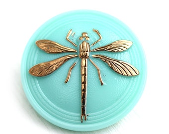 31mm Golden Dragonfly Czech Glass Mint Button, Light Turquoise, Handmade Button bead, size 14, 1pc - 2531