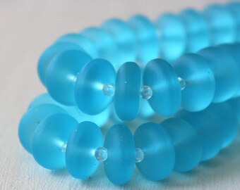 Sea Glass Rondelle - Cultured Recycled Sea Glass Beads - Jewelry Making Supply - Frosted Glass Bead - Aqua - 28pc - 12x5mm