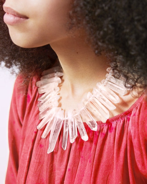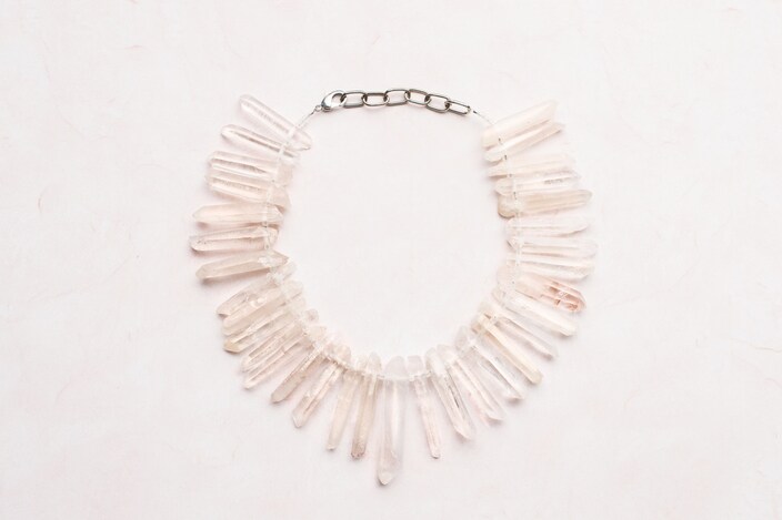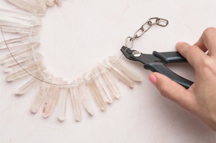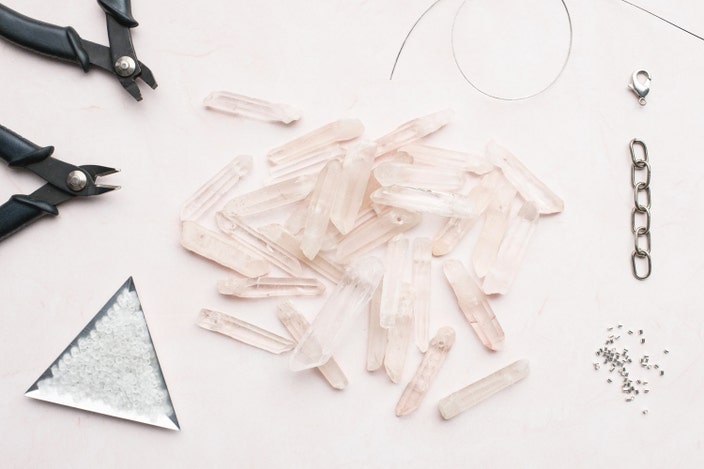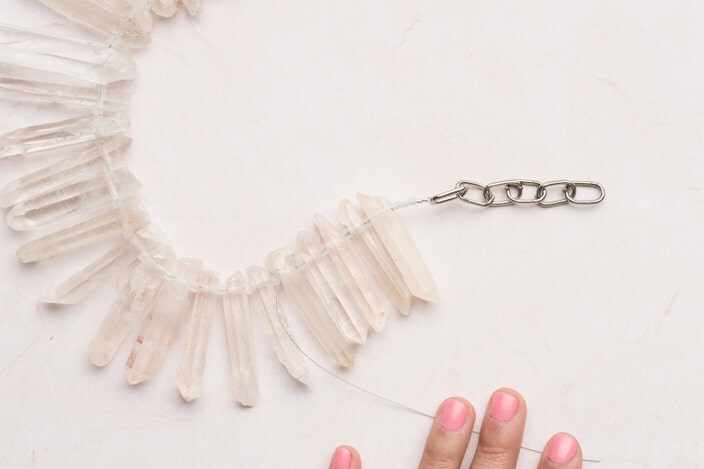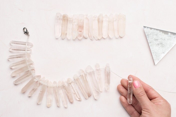 Before you start adding your quartz points, string on 2-3 seed beads. Next, add the quartz points from the arrangement you lined up in Step 1. Separate each quartz point using 1-2 seed beads. Continue adding quartz points and seed beads until your necklace reaches your desired length (being mindful that the chain will add a few inches). When you're finished adding quartz points, string on 2-3 seed beads to mirror the opposite end.