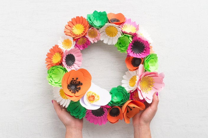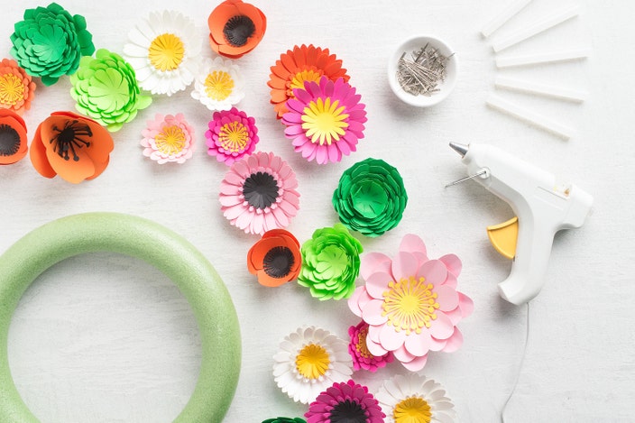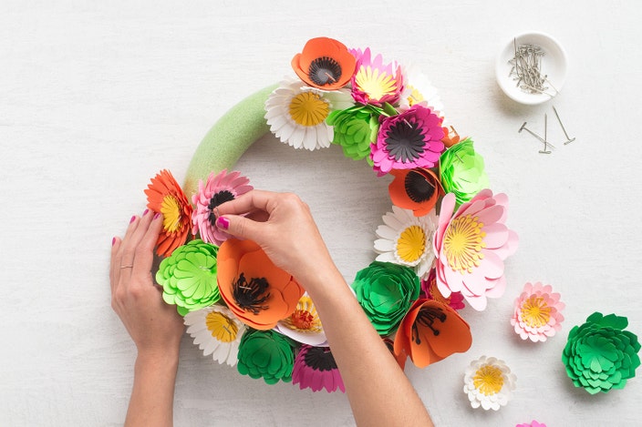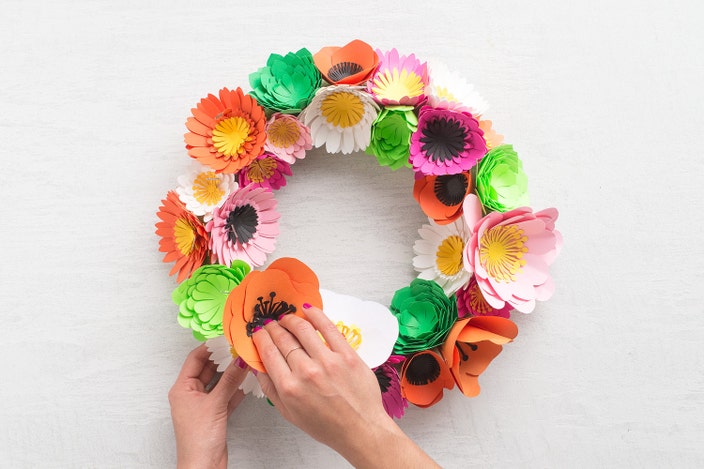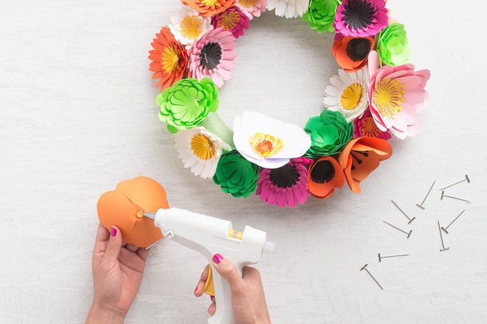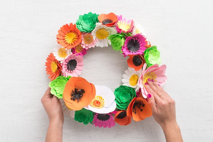 Use pre-made paper flowers to create a spring wreath in just three easy steps.