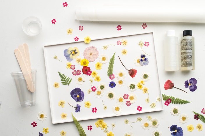 Begin arranging pressed flowers on your tray.