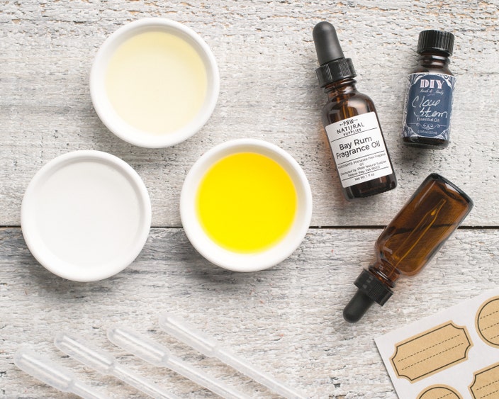 After you’ve added the carrier oils, it’s time to create a custom scent. We used clove bud essential oil and bay rum fragrance oil, but you could use any combination that suits your taste. Tip: If you don't know which custom scent combination you'd like to make, hold the fragrances up to your nose two at a time to get a better idea of what the two would smell like when mixed.
